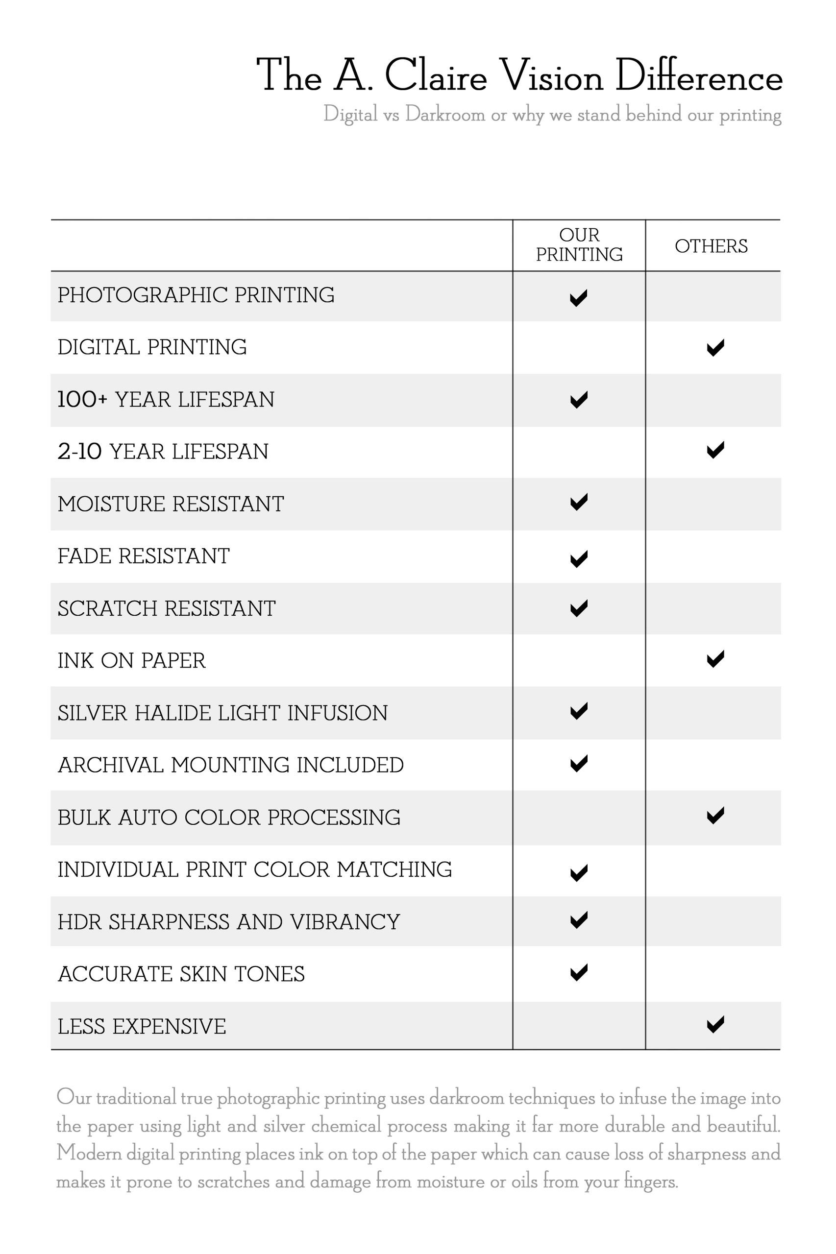 We all use digital printers in our daily lives, and they’re great for everyday printing. But they are ink on paper which will scratch and fade. True photographic printing is light on paper, so with proper care, the image won’t fade or deteriorate. Check out the comparison chart at the bottom of this page to see how this sets me apart from other photographers today, as most are now using digital printing to save money. Need more convincing? Check this out: Digital Difference